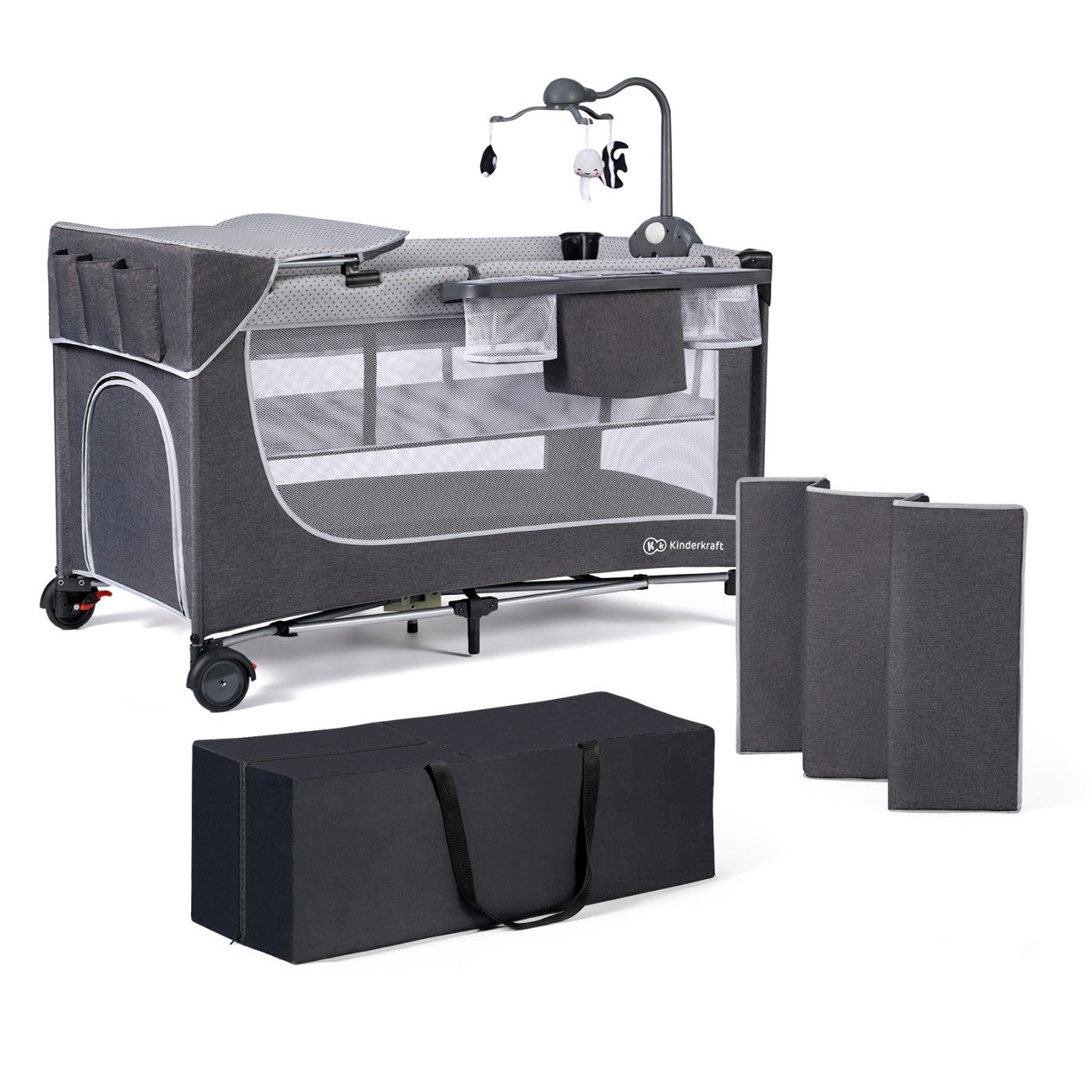 Patutul de călătorie Kinderkraft LEODY, cu accesorii, GREY este soluția ideală pentru părinții mobili, oferind un spațiu confortabil și sigur pentru copil chiar și în afara casei. Acest produs compact și funcțional înlocuiește la un loc patutul, masa de infasat și comoda, fiind dotat cu accesorii practice precum o masă de infasat montată pe cadrul patutului și un raft pentru scutece.