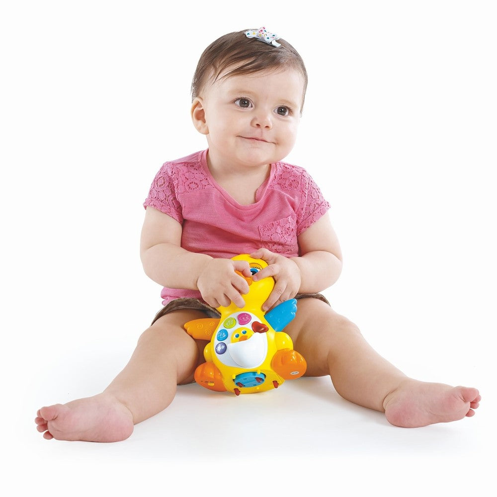 - Este capabilă să cânte 7 melodii diferite, menținând micuții captivi.