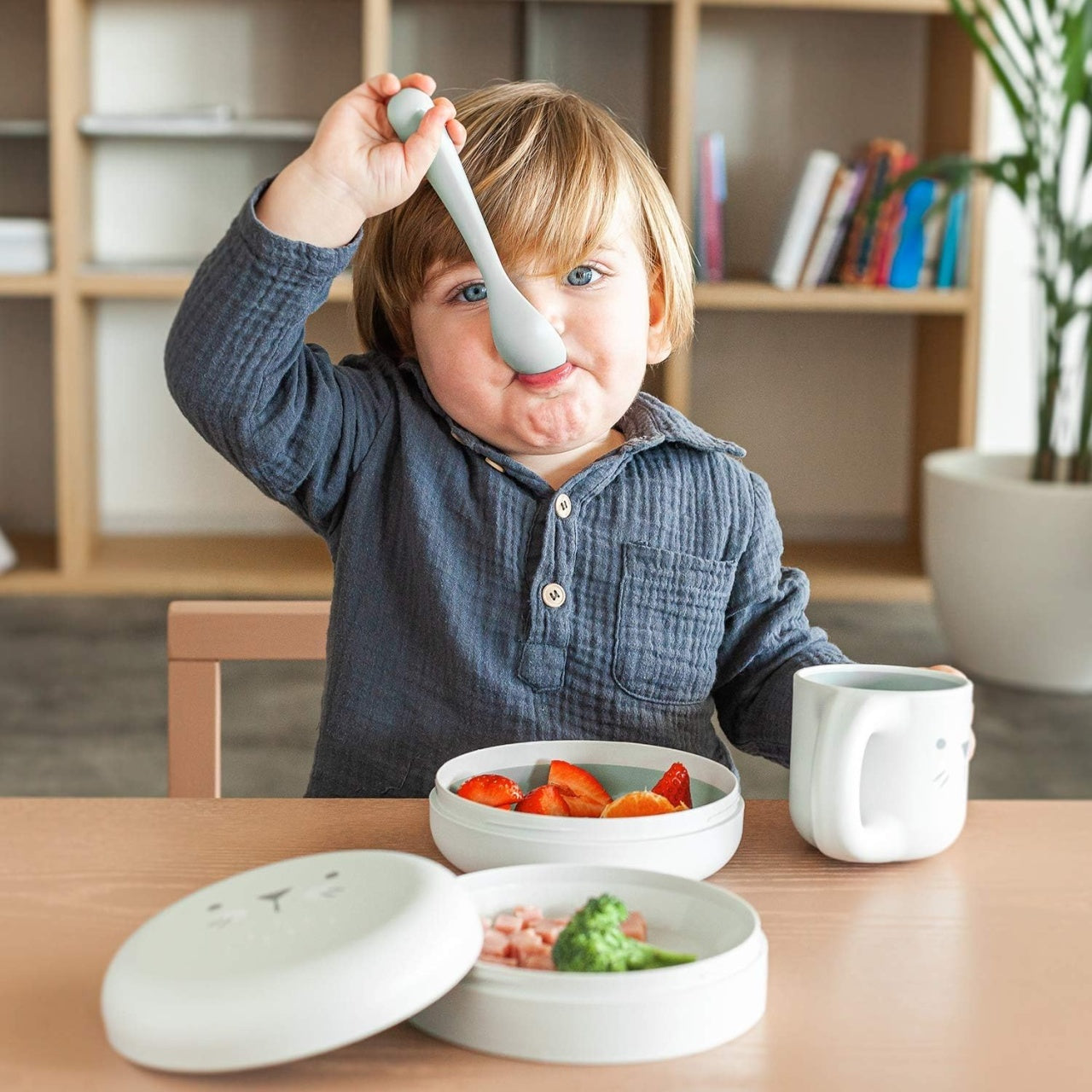 - Setul include două boluri pentru două mese: un bol adânc de 285 ml pentru alimente lichide și un bol adânc de 210 ml pentru alimente solide.